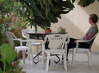 ... på verandan kopplar stipendiaten Helena av med en kopp te ... |